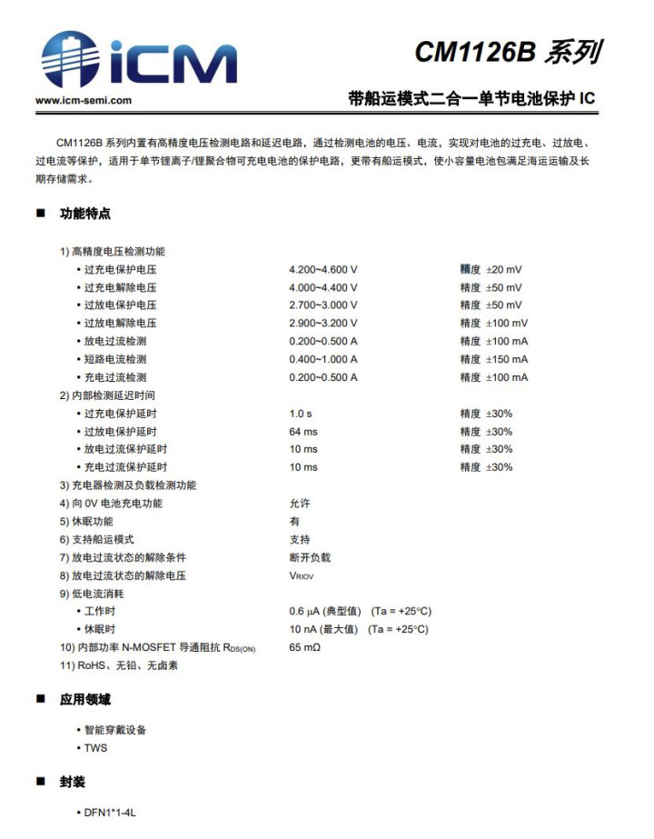 ICM创芯微CM1126B-JCC带船运方式二合一单节电板保护IC。CM1126B系列内置有高精度电压检测电路和延长电路,通过检测电板的电压、电流,终了对电板的过充电、过放电、过电流等保护,适用于单节锂离子/锂团聚物可充电电板的保护电路,更带有船运方式,使小容量电板包知足海运输送及长期存储需求。