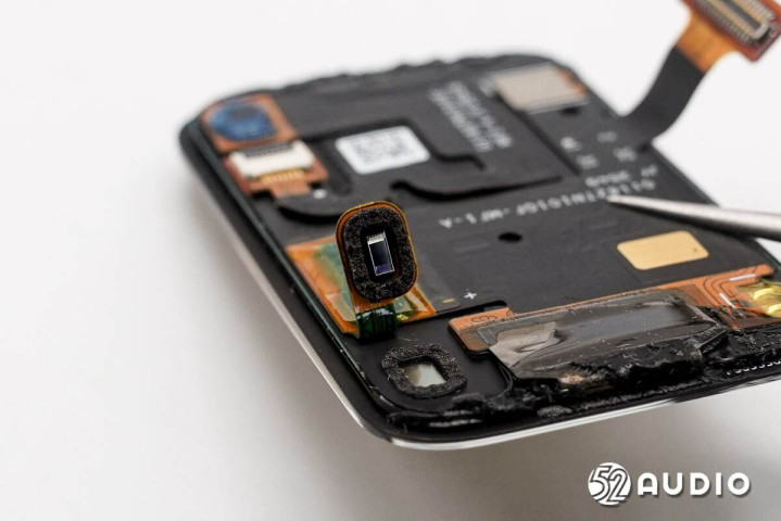 健康监测传感器模组特写,包括两个LED照耀灯和两个用于经受反射色泽的感应器构成。