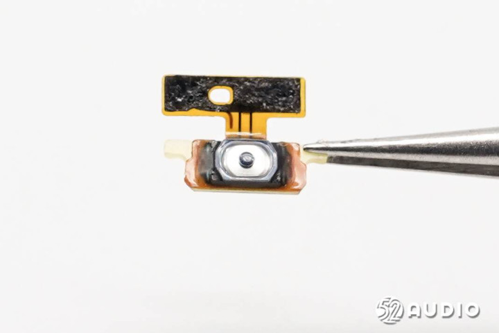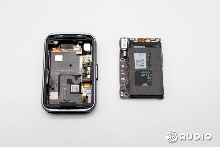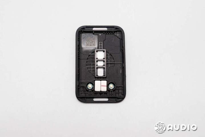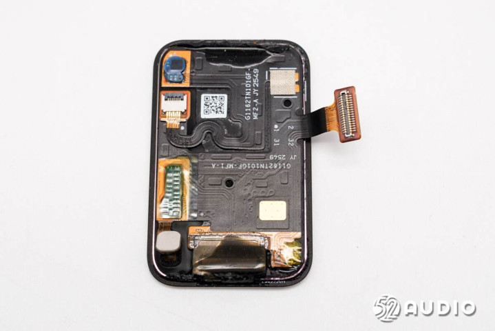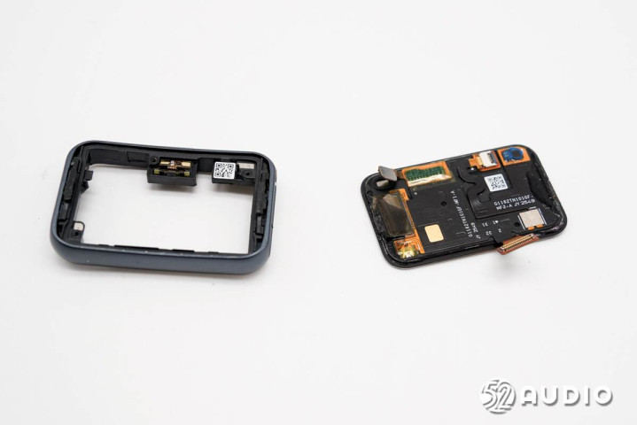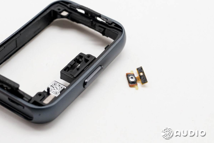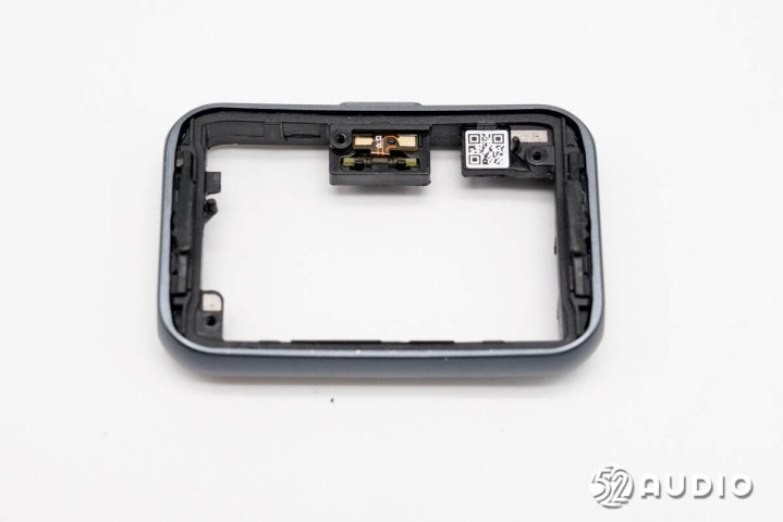 手环中框结构一览,腔体壁上还固定有功能按键排线,与主板通过触点衔接。