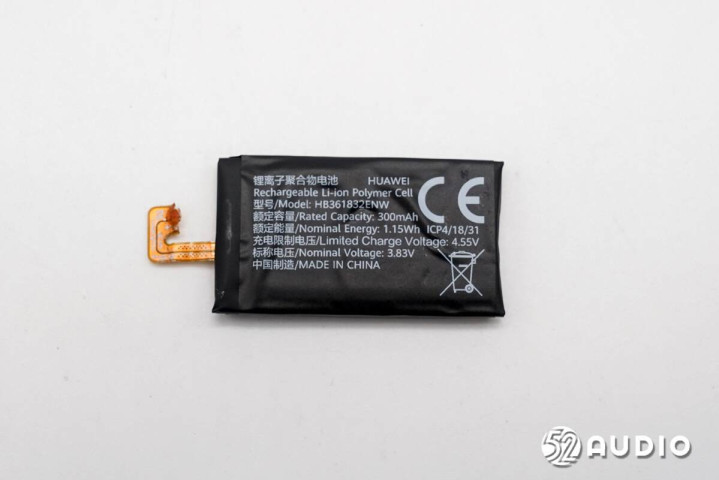 手环内置电板标签上信息一览,锂离子团聚物电板,型号:HB361832ENW,额定容量:300mAh,额定能量:1.15Wh,充电甘休电压:4.55V,标称电压:3.83V,中国制造。
