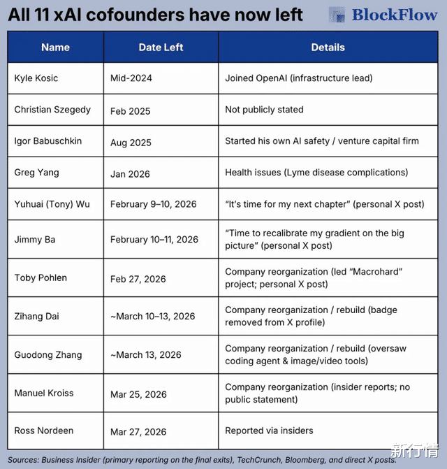 无非凡偶,这几天,xAI的临了一位原始归拢独创东说念主罗斯·诺丁(Ross Nordeen)也打理行囊离开了。至此,与马斯克共同创立xAI的11位战友,已一说念下野。