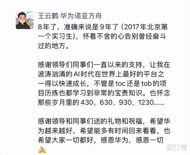 近日,华为诺亚方舟实验室主任、华为盘古大模子负责东说念主王云鹤在一又友圈发文,官宣下野。