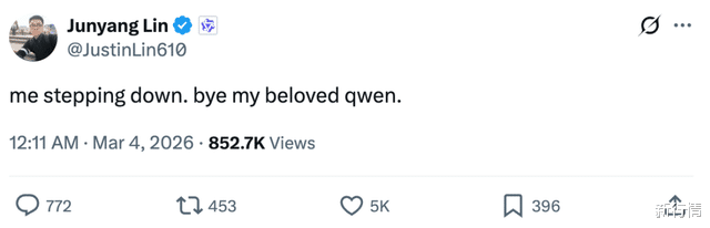 3月4日,阿里 Qwen 团队时刻负责东说念主林俊旸蓦的在鄙俗媒体发布状况:“me stepping down. bye my beloved qwen.”(我辞职了,再会了我爱的 qwen)。