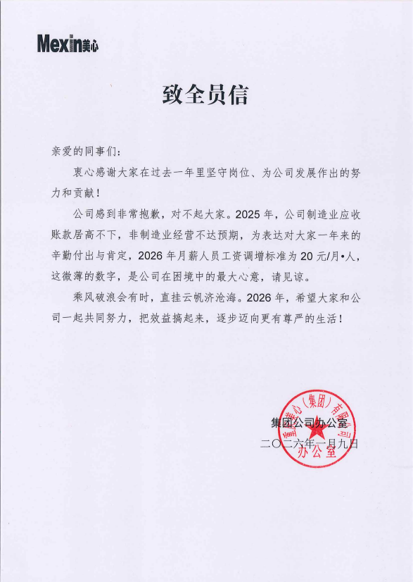 近日,重庆好意思心集团一份对于2026年度调薪的致歉信受到真贵。信中称,本年公司决定为下层职工涨20元月薪,并对涨幅较低抒发歉意,“止境抱歉,抱歉巨匠”。