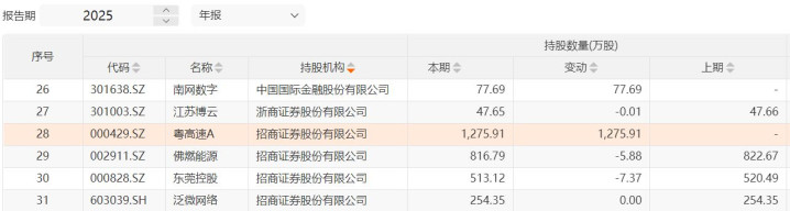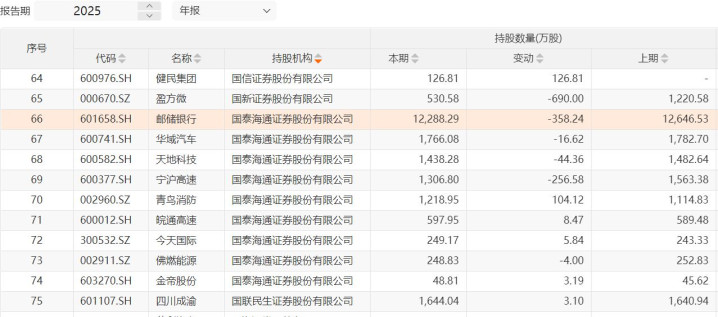 举例2025年年底,招商证券新进粤高速A1275.91万股,这家公司功绩隆重,年化股息率超越4%。国泰海通持有邮储银行1.22亿股、宁沪高速1306.80万股、皖通高速597.95万股;国联民生则持有四川成渝1644.04万股。