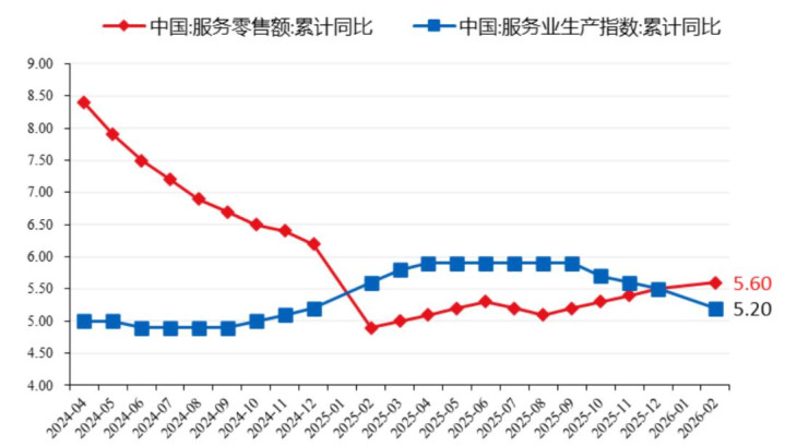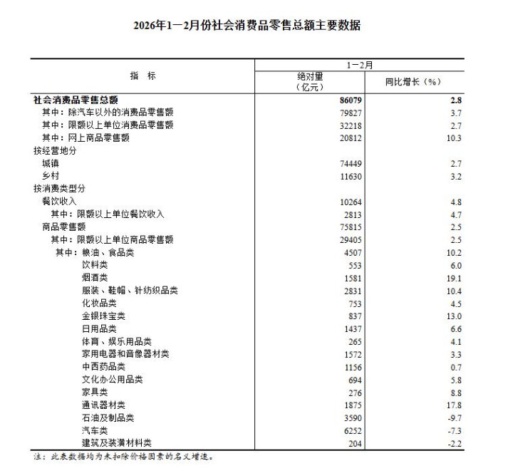 国度统计局发布的数据自满,1-2月,社会浪掷品零卖总和同比增长2.8%,比上年12月高出1.9%,其中办事浪掷捏续高景气,办事零卖额同比增长达5.6%,自前年2月以来捏续处于回升态势。