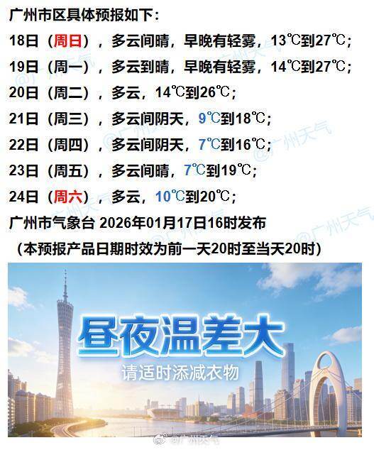 展望,18-19日广东大部晴到多云,清晨有(轻)雾,部分市县有稀零小雨,旦夕寒凉。